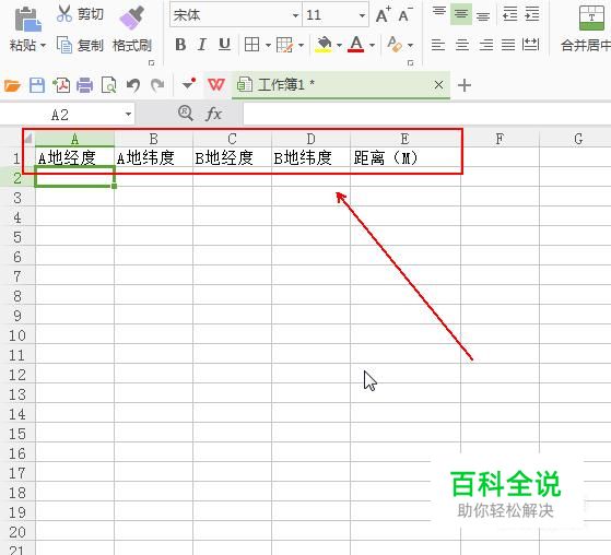 在Excel表格的A1-E1单元格中依次输入下列信息。A地经度、A地纬度和B地经度、B地纬度.千万不要弄错顺序