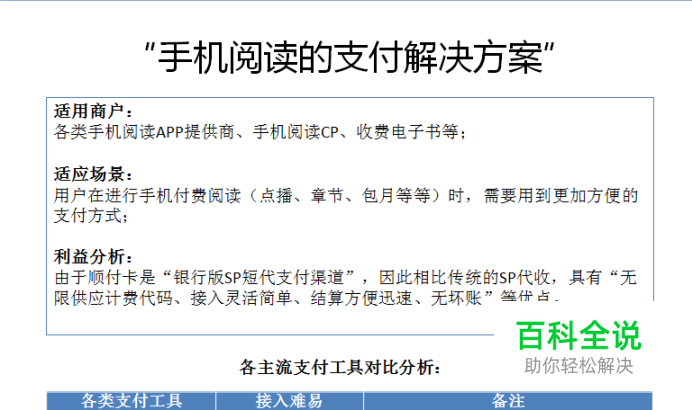 手机阅读的支付解决方案 随着移动互联网开启了老百姓的日常生活之门,手机阅读正在蓬勃发展。在传统的电信运营商所提供的手机阅读之外,各类APP正在迅速提升市场份额。“用户、内容、流量、支付”作为制约手机阅读的几个模块,也在悄然发生变化。针对运营商环境之外的手机阅读支付模式,也相应有了值得一试的解决方案。 适用商户: 各类手机阅读APP提供商、手机阅读CP、收费电子书等; 适应场景: 用户在进行手机付费阅读(点播、章节、包月等等)时,需要用到更加方便的支付方式; 利益分析: 由于顺付卡是“银行版SP短代支付渠道”,因此相比传统的SP代收,具有“无限供应计费代码、接入灵活简单、结算方便迅速、无坏账”等优点。 支付原理图: