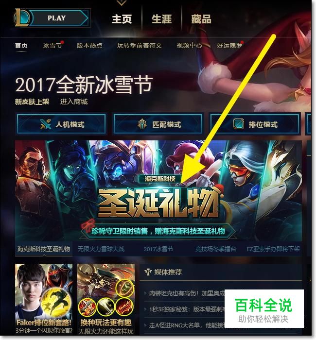 首先我们登录英雄联盟的游戏客户端,在主页上面找到海克斯科技圣诞礼物,点击进入。