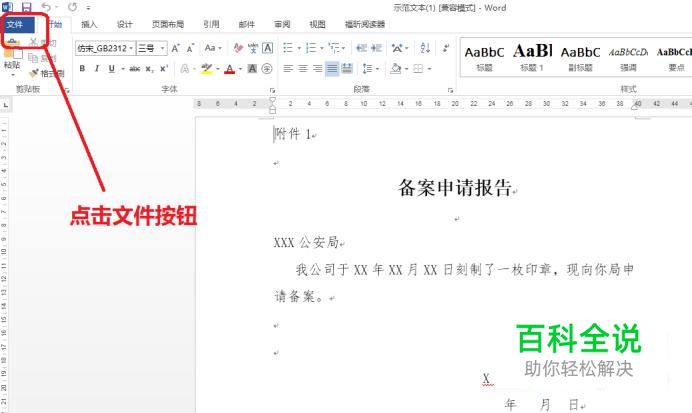 选中示例文稿双击启动word2013示例文稿,进入word文档界面,选择文件按钮。