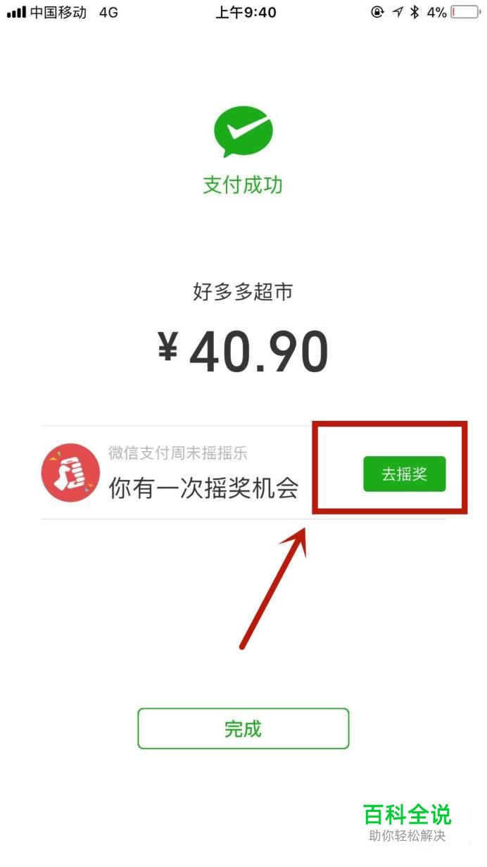周末的时候只要你去一间小卖部或者是商超购物且用微信完成付款动作,就会出现以下的界面。首先点击去摇奖。