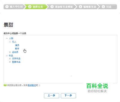 中心词创建流程:填写中心词名、为中心词选择分类、选择一张该分类下联系表、填写联系表数据。