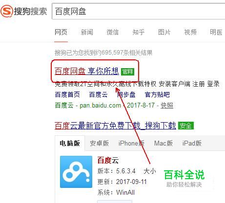 使用搜狗搜索引擎搜索关键词“百度网盘”
