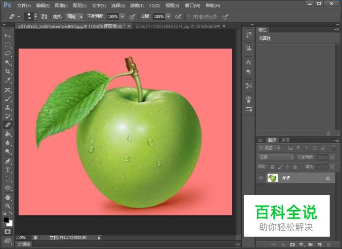 打开苹果素材和冰块素材后,先点击魔棒工具粗选苹果素材区域,进入快速蒙版,抠出苹果的选区。
