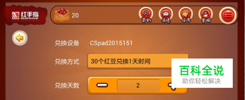 VIP设备红豆兑换界面。界面上将显示设备号、红豆与VIP设备控制时间的兑换比例、以及兑换时间天数。