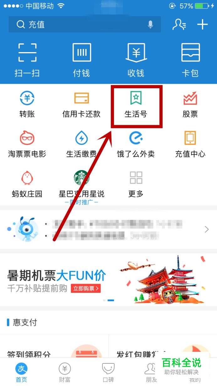 打开支付宝,找到“生活号”这个应用。如果你的主页面找不到,说明它不是你常用的应用,可以直接搜“生活号”。