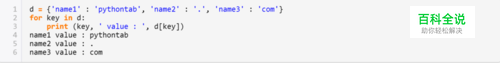 如果只需要值,可以使用d.values,如果想获取所有的键则可以使用d.keys。 如果想获取键和值d.items方法会将键-值对作为元组返回,for循环的一大好处就是可以循环中使用序列解包。 代码实例: