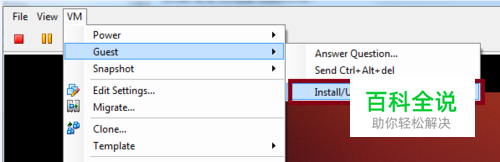 点击VM窗体上方菜单栏中的“VM”菜单项, 然后在弹出的子菜单中中点击“Guest”=>"Install/Upgrade VMware Tools"