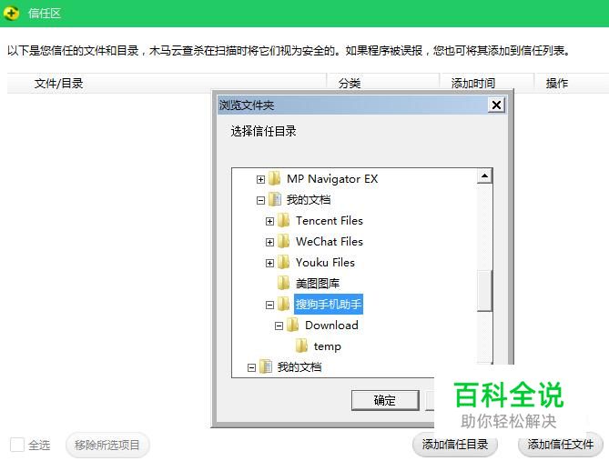 比如,我点击“添加信任目录”,选择我的文档里面的“搜狗手机助手”,防护软件就会信任该文件夹和里面的应用程序。