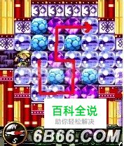 将瓦缸向左拖动一格,使岩石一同移动,得到右面岩缝内的宝箱后返回。此时已经得到两把钥匙了,打开通道踩下检查点。 把岩石推到石块上面,再触发冰锥下降,石块便不会被毁掉。用这种方法小心将冰锥全部引掉,之后再将岩石推到机关上,踩下检查点。 一直向上走,敲下红色宝石机关。返回进入右边的房间,先利用少林弟子消灭雪猿,再将右方的瓦缸推到地洞中,把岩石浮起来。之后再把另一个瓦缸拉到地洞左边,将岩石推下消灭少林弟子。得到宝箱内的黄金钥匙后,去左下方的房间。 迅速进入踩下检查点,吃掉宝箱后敲打宝石机关。迅速触动冰锥后跑到红色红杠上方,等冰锥触动机关后从另一边出去。这时有了两把黄金钥匙,打开右上方的通道通关。 STAGE6:入关后迅速吃掉钻石,按图中所示进入秘道。向下走,从被锁住的通道上方通过。小心避过几只怪物,在下方的房间内看准时机敲掉石块,用龙像眼中的射线干掉怪物,向右踩下检查点。