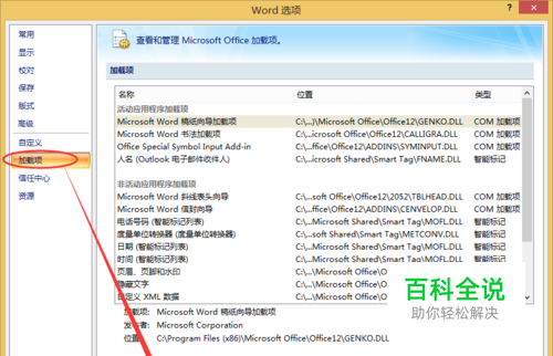 打开 word选项 ,找到加载项。 加载项里选择 COM加载项 点 转到