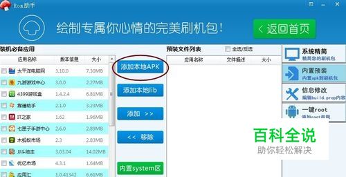把下载好的rom助手安装完毕后,打开。点击界面中“预装APK”工具。选择下载好的rom包进行加载。稍等片刻,等待加载完毕。然后选择界面上的“添加本地APK”按钮,将superuser添加到rom包里。