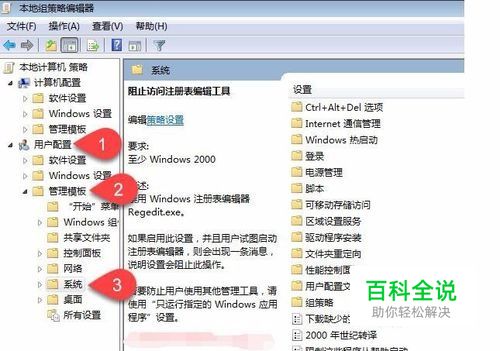 从Windows开始菜单的运行窗口,执行 gpedit.msc 命令,打开系统组策略编辑器,然后依次打开 用户配置-管理模板-系统-阻止访问注册表编辑器