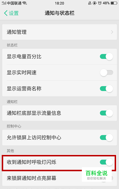 2、然后打开【收到通知时呼吸灯闪烁】开关。
