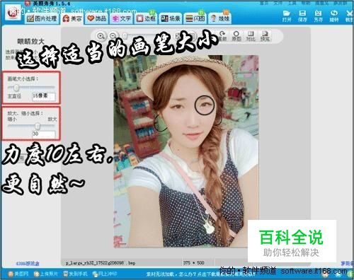 打开要处理的照片,选择“美容”菜单下的“眼睛放大”功能。画笔力度不要太大,否则就不自然喽! 选择适当画笔