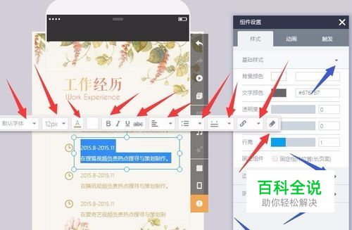 第四步,编辑场景里面的内容。如果是自己空白添加的,那所有地方都要自己设置;如果是套用模版,那就修改模版现有的东西就行,比如要修改某行文字,那就双击该行文字,就可以编辑了,如过要添加文字,从上面的菜单栏里选择文字,点一下,手机框里就出来文字编辑框了,还可以把文字整体拖拽,选中要编辑的文字可以对其设置加粗,倾斜、超|链接、对其方式等操作。