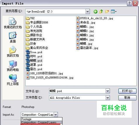 打开AE,导入“蝴蝶.psd”和“背景.jpg”。在导入做好的“蝴蝶.psd”时,“Import As”选项中选择“Composition-Cropped Layers