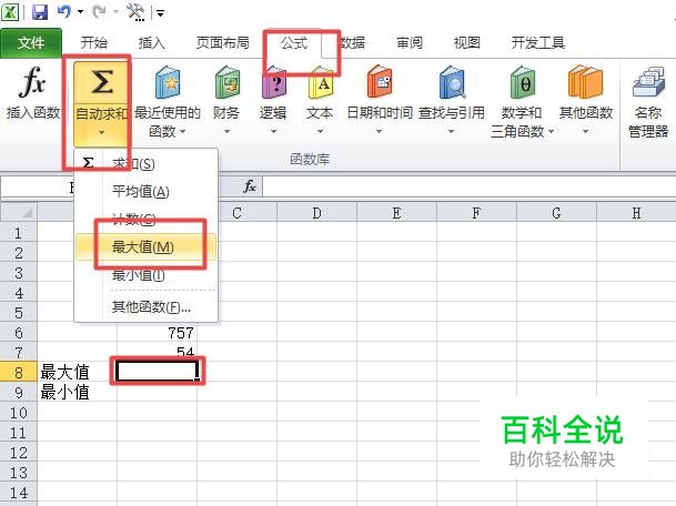 之后我们选中图示中的单元格,之后点击公式,点击自动求和的下拉箭头,弹出的界面,我们点击最大值;