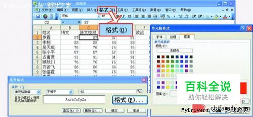 Step2:设置好校对方式及背景颜色 选择C2区,点击“格式→条件格式”,将选项依次设定为“单元格数值”、“不等于”、“=B2”,再在“单元格格式”中选择“图案”,并于“单元格底纹 颜色”下选取红色,“确定”后返回。经过这样设置后,如果单元格C2与单元格B2数值不相等,则单元格C2的底纹变为红色,若相等,则不会有任何变化。 设置校对方式