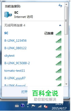 等安装提示完成后,在电脑右下角,会出现一个无线图标:WIN7和系统系统有点不一样,用鼠标放上面会有提示的,打开这个无线图标,上面会出现很多附近的WIFI,找到自己家的无线,点连接: