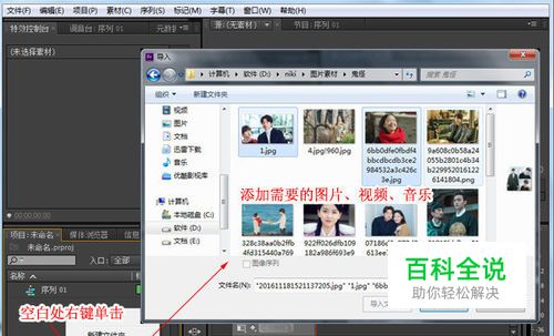 在项目:未命名的框里空白处,点击鼠标右键出出现小框选项,点击“导入”即可。在弹出来的窗口里选择需要的图片、视频、音乐(视频和音乐是如果要在图片后添加视频或者音乐的话,才需要添加,若不需要可以不添加),并“打开”。