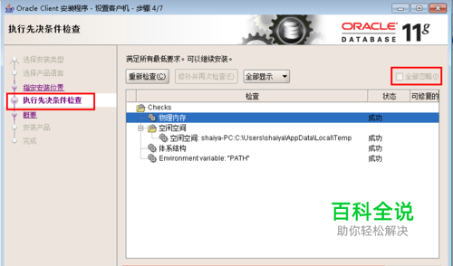 6.这里后退了一步,安装前会对系统“物理内存”和“空闲空间”进行一个检查,我这里全部通过检测,如果没有通过检测的话,会提示报错信息。如果你确定你安装程序的磁盘空间足够的话,可以直接选择右上角的“全部忽略”,如果你是完美主义者,可自行去网上查找解决方案,这里不详细赘述了。