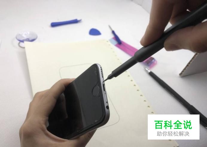 接着准备一个吸盘和一个小号的螺丝刀,用螺丝刀把iPhone8最下面的靠近喇叭的螺丝拧下来。