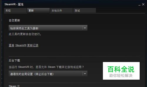 l 在“更新”一栏选择更新方式5. 启动SteamVRa)可以点击Steam客户端右上角的“VR”按钮启动SteamVR。如果“VR”按钮没出现,也可以点击“库” -> “工具”下的“SteamVR”菜单项;b)或者在安装steamVR时,选择创建桌面快捷方式,可以在桌面上直接点击打开。6. 房间设置和SteamVR教程a) 第一次启动SteamVR,会自动进入房间设置,如果房间设置没有自动启动,请点击状态窗口上的SteamVR菜单然后选择房间设置。请根据提示完成设置b) 房间设置完成后,会进入SteamVR教程。如果教程场景运行显示正常,现在您应该可以看到如下的SteamVR状态窗口, 恭喜您可以使用大朋头盔运行Steam上的VR内容了。