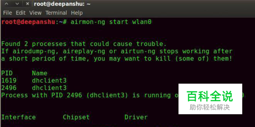输入“airmon-ng start wlan0”开启无线网卡。 这个命令可以无线网卡处于监听状态 *注 wlan0为无线网卡的名称 开启后“wlan0"变为”mon0“ kali 变为wlan0mon