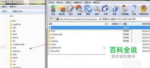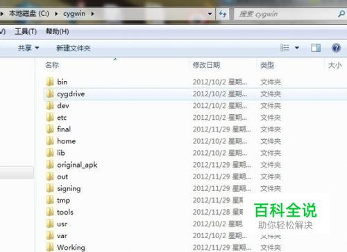 然后我们会看到我们的命令行进入的是厨房的根目录,如图所示。 如果你是按照我上面提到的厨房安装教程安装的Cygwin,此处命令行默认定位到的是C:\cygwin\home\username下这里需要执行两次cd ..命令返回到 Cygwin根目录下才能找到apktool.sh文件。当然如果之前你直接将Cygwin定位设置为根目录或者将工具放置于你的用户名下此步骤可省略。