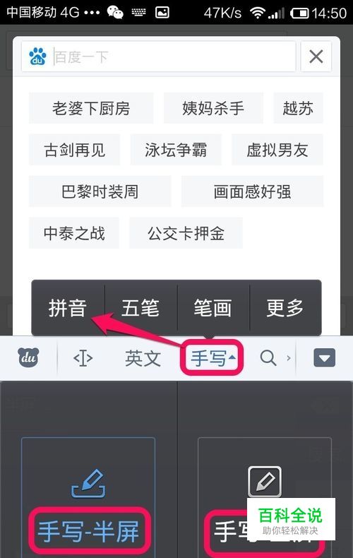 现在我们已经可以手写输入了,点击这里的半屏 /全屏,可以方便的对手写进行设置和选择!当然我们点击手写也可以直接切换为其它的输入方式!