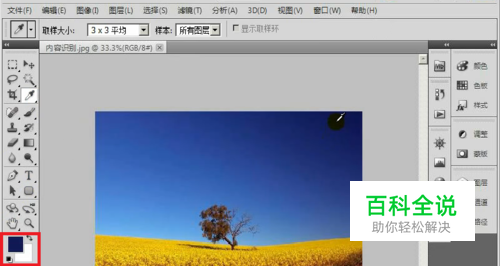 选择“吸管工具”。并点击图片中您想吸取的颜色,您会发现PS的前景色会变成您所吸取的颜色,如图