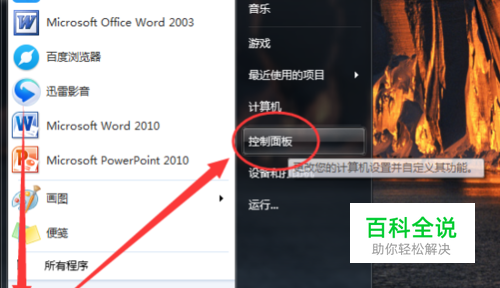 1、点击“开始”图标按钮,在打开的开始菜单选项框中点击“控制面板”选项。如图所示;