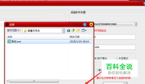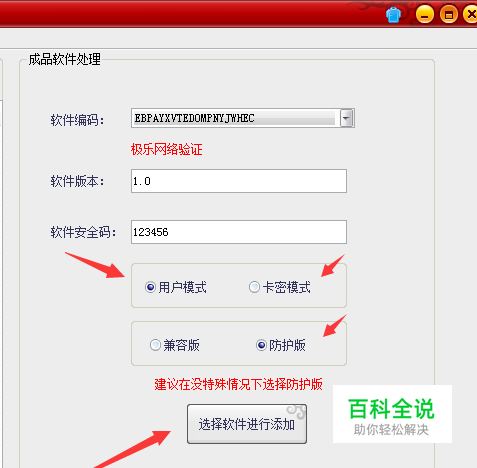 添加软件后,点击防护设置,进去成品软件处理区域,选择对应的客户端模式,有卡密模式和用户模式,可根据要求自行选择,选择后点击下面的选择软件按钮