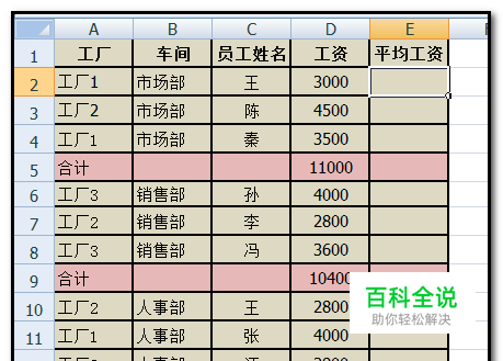 以下图中数据为例演示操作方法。 现在,要计算出员工的平均工资,得出的结果显示在E2单元格。 从表格中可以看到,D列数据中插有“合计”的数据。所以我们要跳开“合计”的数据,再进行计算员工的平均工资。