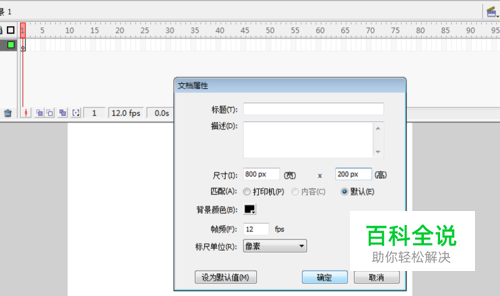首先启动flash软件,新建一文档,大小为800*200,背景颜色为黑色,帧频为12fps。