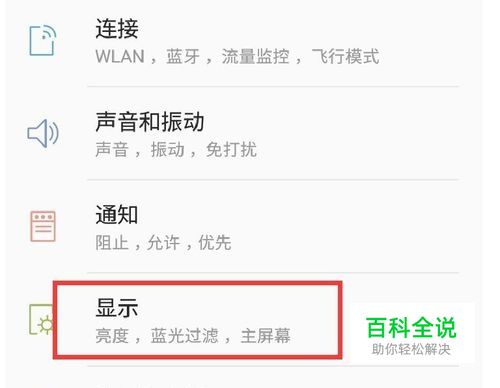 打开手机的“设置”,向下翻,如图所示,找到“显示”一项,点击进入。
