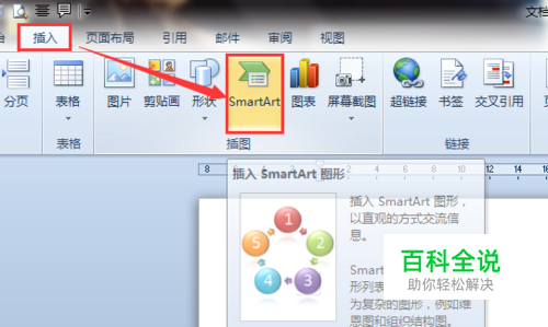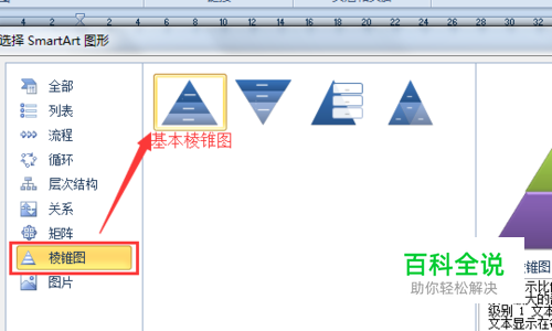 【插入“SmartArt”】 今天制作彩色金字塔形状,需要使用“SmartArt”里面的一种棱锥图样式。 打开Word 2010文档的“插入菜单”,点击【SmartArt】选择里面的“基本棱锥图”,用于显示比例关系、互连关系或层次关系,最大的部分位于最底下。