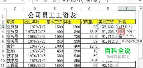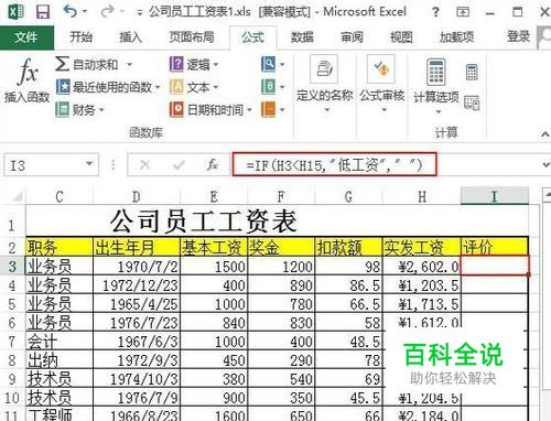 1、用Excel2013打开公司员工工资表,在I3单元格中,我们输入“=IF(H3<H15,"低工资"," ")”,并按“Enter”键,得到如下结果。