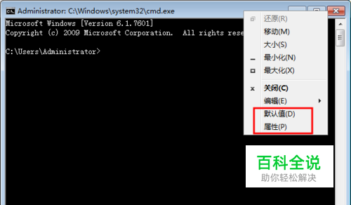 打开cmd,在边框上点击右键,在弹出下拉框中选择点击“默认值”或“属性”