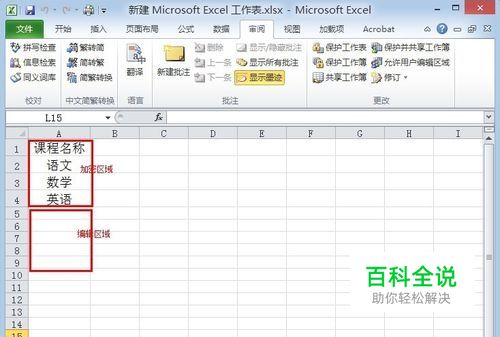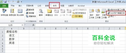 在excel表格使用中,我们经常会遇到这样一种情况,为了防止数据丢失,希望原有的数据不能编辑、只能查看,然后可以在下面在增加一些数据。例如下例课程表,语文、数学、英语变更需要密码,但是可以在下面接着增加物理、化学,下面介绍操作步骤。