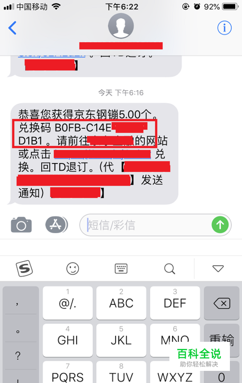 首先准备好你收到的卡密,比如我收到的就是发过来的手机短信,如下图所示。还有的直接就是一张卡,卡背后有对应的卡密,但是兑换方法都是一样的。