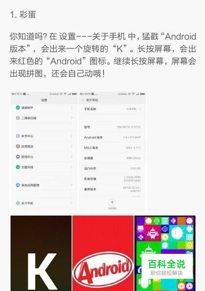 彩蛋功能 你知道吗?在设置中,关于手机中,猛戳“Android版本”,会出现一个旋转的K。长按屏幕会出现一个红色的安卓图标,继续长按会出现拼图功能,还会自己动哦!!