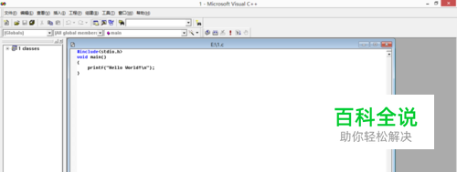 新建好之后,如图所示,是白色界面,在里面输入程序就可以了。 第一次编程,输出"Hello Wrold!"。 代码: #include<stdio.h> void main() { printf("Hello World!\n"); } 复制这些进去就可以了。