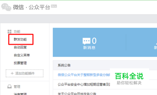 进入公众号主页后,选择如图所示的群发功能,点击进入