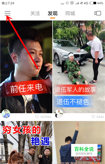 快手中想要删除关注的人需要打开他的个人主页,打开手机中的快手后点击左上角的【三】。