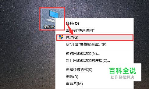 在电脑桌面选中”此电脑“图标,鼠标右击在弹出来的列表中选择”管理(G)“,如下图所示。