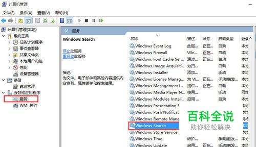 进入到”计算机管理“窗口,点击左侧的”服务和应用程序“→”服务“,在右侧的服务名称中找到”Windows Search“,如下图所示。
