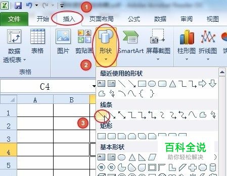 打开Excel2010文档,选择单元格。 单击“插入”菜单,在“插图”工具组中选择“形状”工具。 在弹出的下拉列表“线条”菜单中选择“直线”。