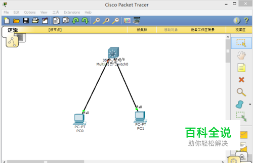 将三层交换机和两台PC用直通线连接起来,如下图所示: